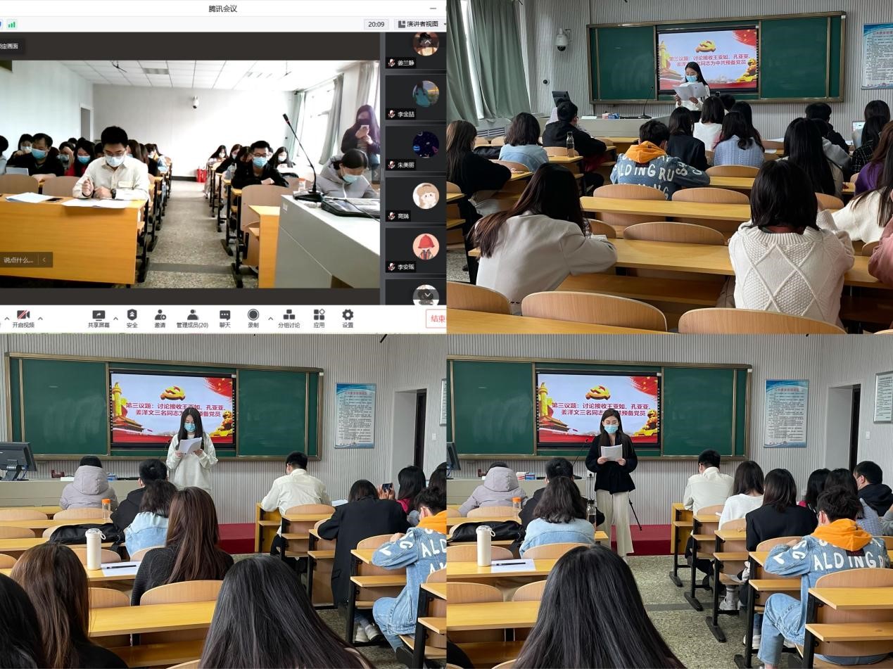 411室)相结合的模式开展。会议由研究生党支部书记李佳泰主持,学院党委书记罗文伟、王亚如、孔亚亚、姜泽文以及15名积极分子列席会议。