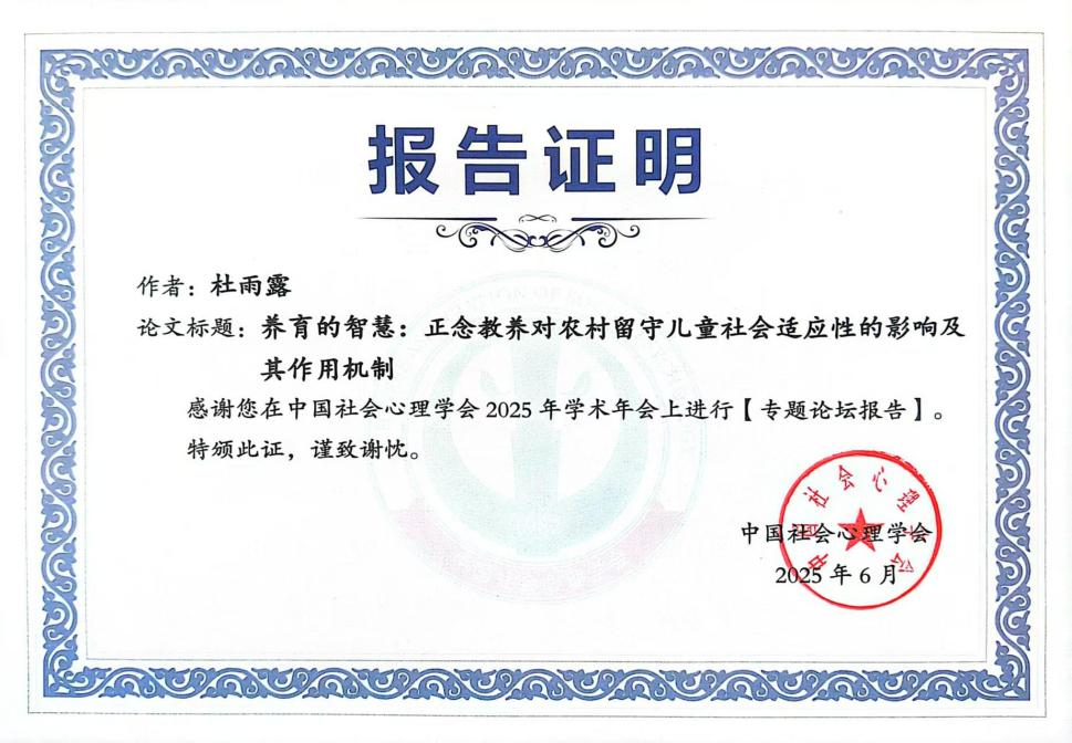“能够在全国性的学术平台上分享自己的研究,并与专家学者交流,是一次非常难得的学习机会,这次经历让我更加坚定了从事心理学研究的决心。”杜雨露同学说,“未来我将继续努力,争取为促进社会心理健康贡献自己的一份力量。”