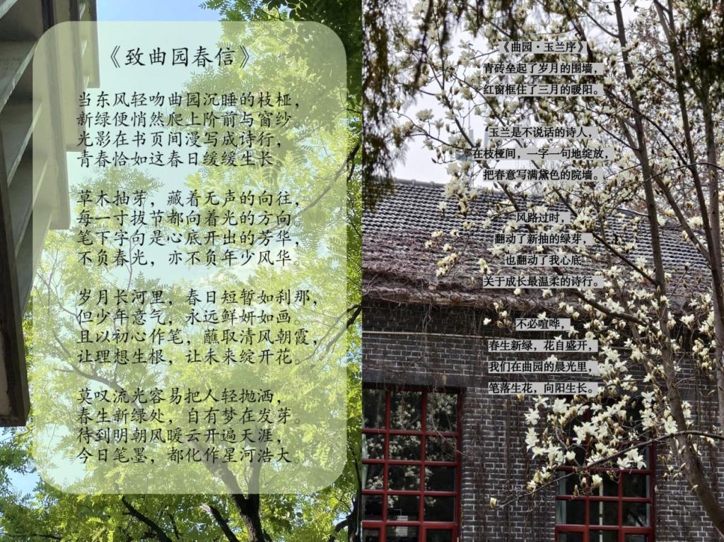 此次曲园春日小诗征集活动圆满落幕,成功为同学们搭建了一个抒发才情、感悟春韵的平台。大家在笔墨流转间捕捉曲园春景,进一步深化了对校园的热爱与眷恋。活动中,同学们以春为媒、以诗为友,将曲园的柳丝轻拂、繁花缀径、亭台映春等景致,化作灵动的诗句,让春日盛景跃然笔尖,让校园情怀流淌字里行间。参赛作品或清新婉转,或豪迈昂扬,既有对春日草木的细腻描摹,也有对曲园人文的深情咏叹,更承载着同学们对校园的归属感与认同感。
