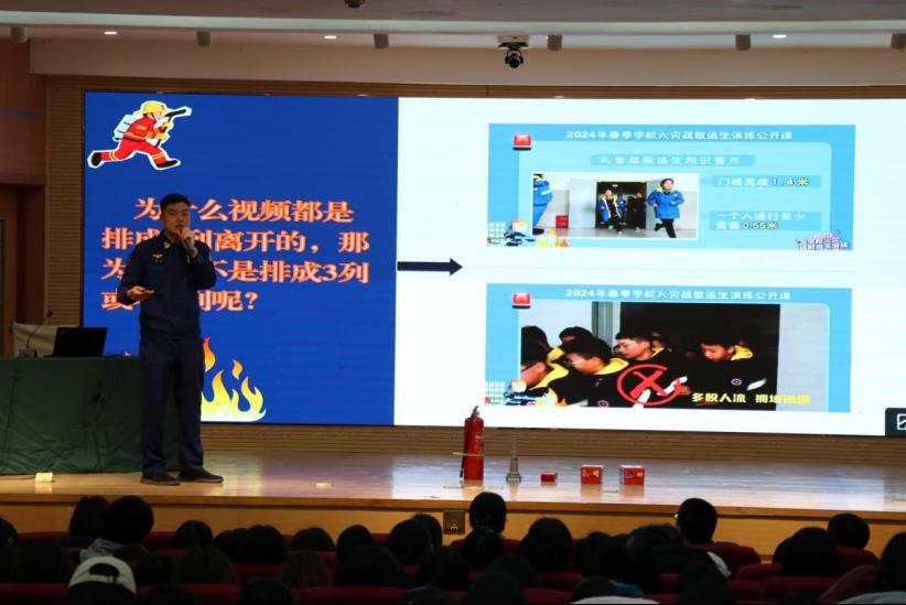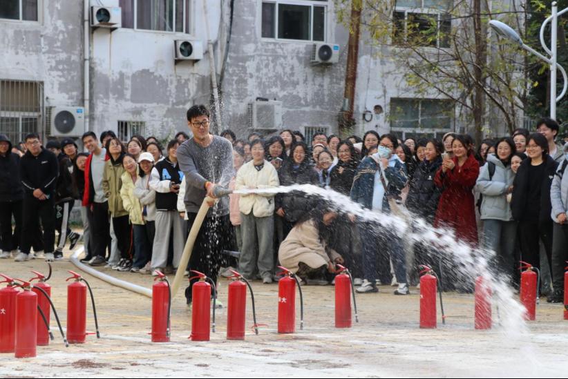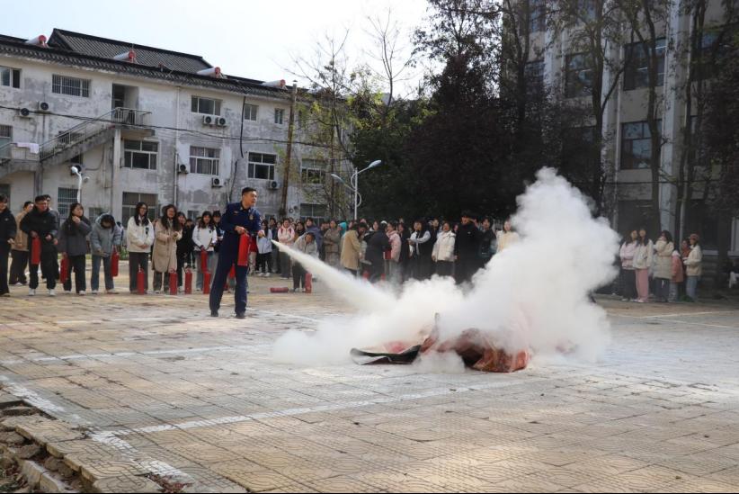 消防安全知识宣讲环节,王磊队长在孔子会堂就理论层面,给广大师生们带来了一场深入浅出的消防安全知识讲座,结合近年来发生在全国各地的几起重大火灾事故案例,包括商场火灾、住宅火灾和校园火灾等,详细分析了火灾发生的原因、蔓延速度及其造成的严重后果,详细阐述了火灾对人民生命安全的威胁、财产损失以及对环境的破坏,强调了日常生活中的火灾隐患排查、电器使用规范、易燃物品的妥善存放等重要性。并与同学们积极互动,“如何在火灾中保护自己?”“如何正确使用灭火器?”,王队长用通俗易懂的语言和生动的实例让同学们更好地理解消防安全知识,还现场演示了灭火器的操作流程,包括如何检查灭火器压力、如何对准火源根部喷射,以及喷射时的正确姿势等,确保同学们能够在紧急情况下正确、有效地使用灭火器进行初期灭火。通过互动式的教学,同学们的消防安全意识和实际操作能力得到了显著提升。