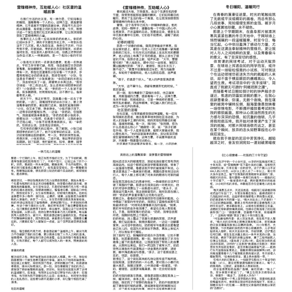 图3 “雷锋精神传,互助暖人心”主题故事征文汇活动部分优秀作品内容展示