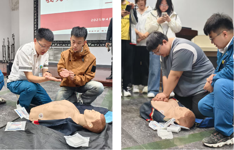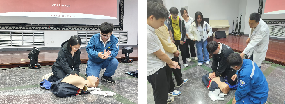 培训中,专家详细讲解并展示了心肺复苏、海姆立克急救和AED除颤仪操作等关键技能,并与现场师生互动演练,强调“黄金四分钟”内采取急救的重要性。我院教师代表吕超和学生代表满金宏、王家瑞、王昊等积极参与实操练习,掌握急救要领。