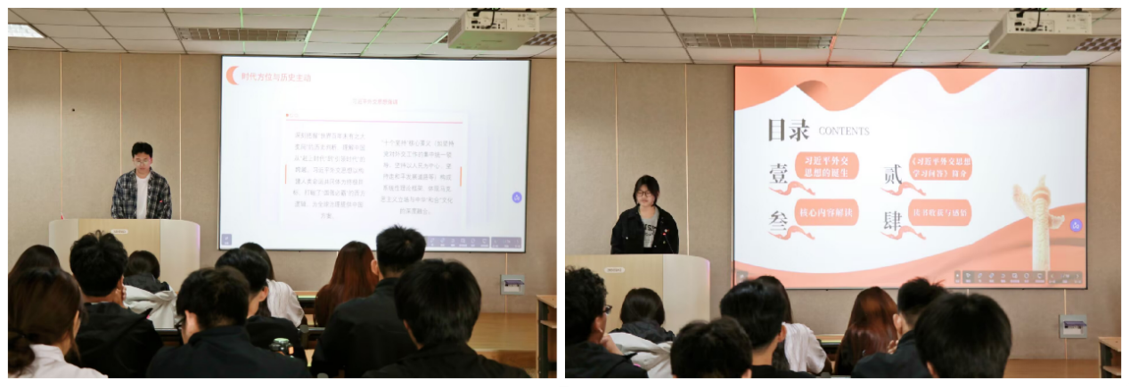 宋西祥在学习《习近平谈“一带一路”》的基础上,结合《习近平外交思想学习问答》一书,进一步分享了自己的见解,从全球角度阐明了“一带一路”倡议的重要意义,这启迪青年与新时代中国外交同频共振,更好锚定青春坐标。金敏深入学习《习近平外交思想学习问答》的核心内容,分享其感悟:新时代青年要坚定对国家发展和外交事业的信心,在党的领导下为实现中华民族伟大复兴和人类进步事业作出更大贡献。