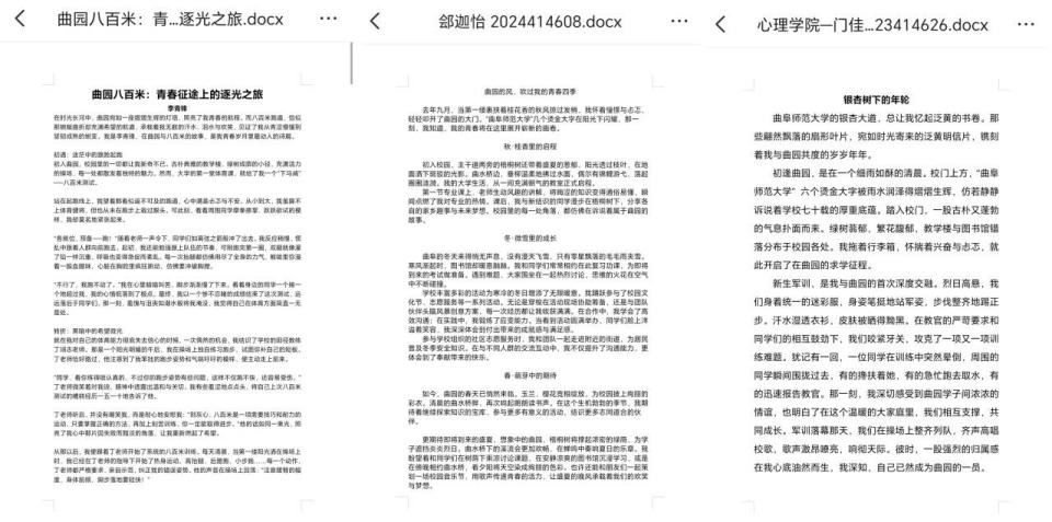 截至5月5日,活动评审团从主题契合度、情感表达、文学性等维度综合打分,经初审筛选,3篇作品进入校级终评,其作品也将作为曲园精神传承的生动注脚,激励新一代学子赓续薪火,再谱华章。