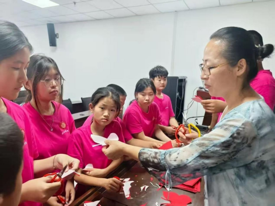 实践队员分组协助修老师教学,针对小学生操作中的常见问题提供个性化指导。例如,队员发现部分孩子折纸时边缘对齐不精准,导致剪出的图案不对称,便采用“对角折叠三次后压痕”的简化方法,提升成功率;队员通过“拇指在上、食指支撑”的口诀,帮助低年级学生纠正剪刀握法,避免纸张撕裂;还鼓励孩子们在传统纹样中加入个人创意,如将生肖动物与花草组合,形成独特构图。