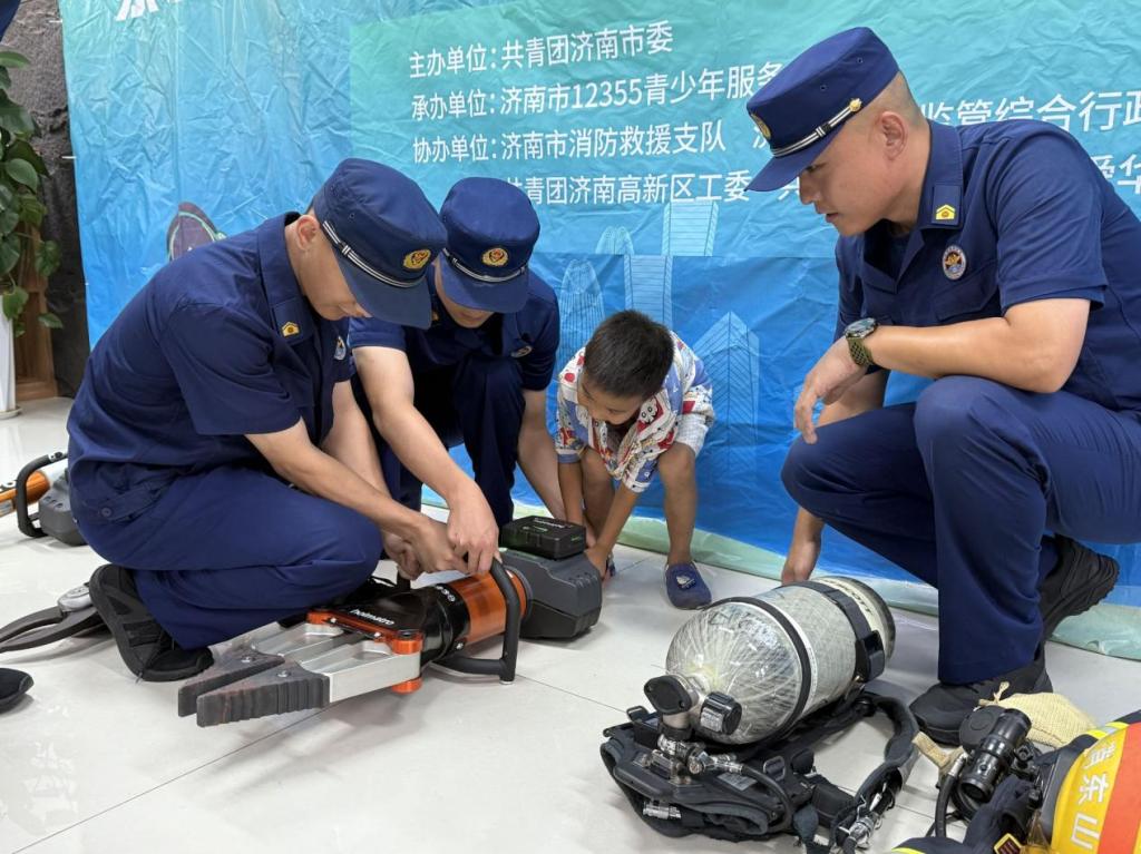 为进一步提升青少年的安全防护意识,实践队特别邀请了济南市消防救援支队的消防员们走进社区,开展消防安全知识宣讲活动。“小朋友们,知道发生火灾要打什么电话吗?”消防员刚开口,台下的孩子就齐声喊出“119”。消防员向孩子们分发了消防安全宣传手册,详细讲解了火灾的危害、火灾报警的正确方法、火场逃生的基本技巧等知识,并进行了消防设备体验环节。通过这一系列直观、生动的活动,消防安全知识深深植入了孩子们的内心世界。举办方表示“将消防安全宣讲融入活动,既能拓宽孩子知识面,又能增强其应对突发事件的心理韧性,体现“三下乡”“服务乡村、助力成长”的理念。”
